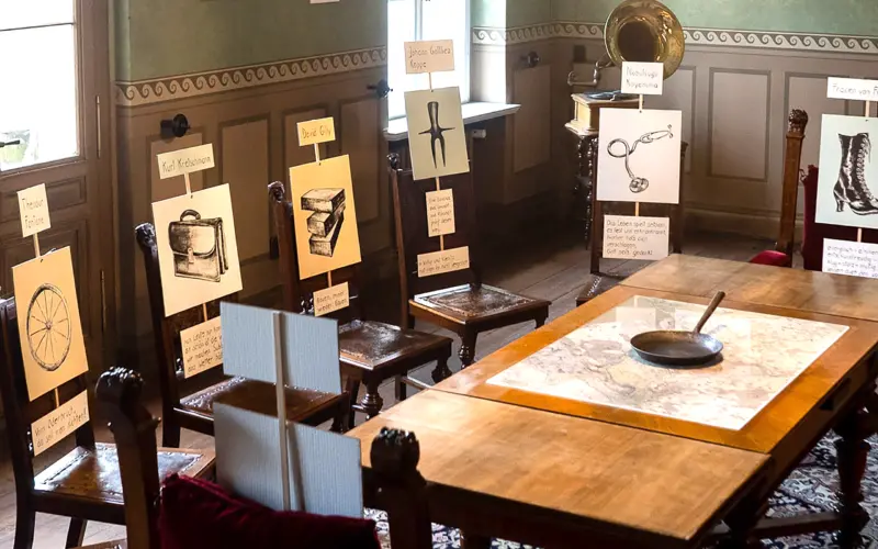 Objekte zum Jahresthema und der Möglichkeit, auf dem Beschreibtisch Kommentare und Gedanken zu hinterlassen.