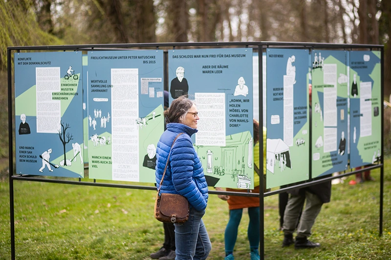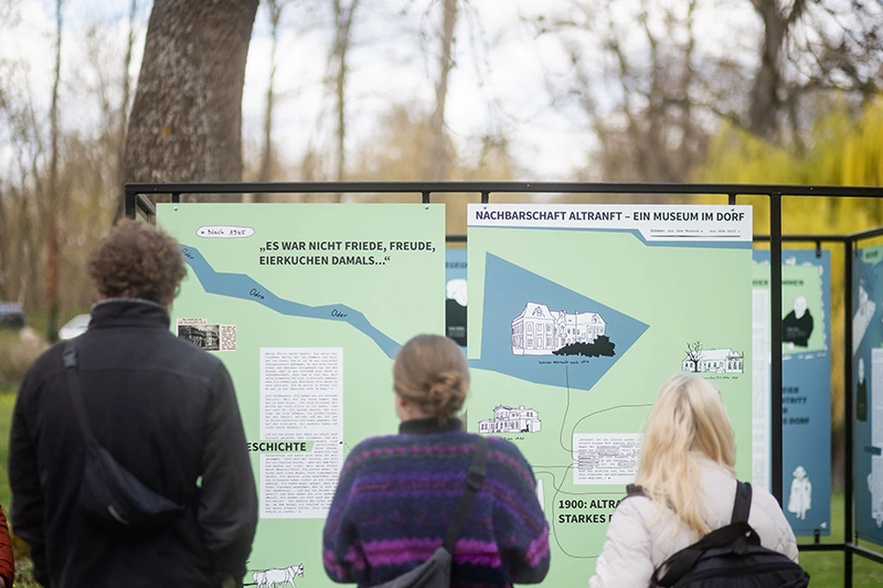 Im Schlosspark am Landgraben zeigen wir die Ausstellung „Nachbarschaft Altranft – Ein Museum und ein Dorf“. Die Kulturwissenschaftlerin und Zeichnerin Mathilde Scholz hat mit rund 20 Menschen in Altranft über das Dorf und ihr Engagement für ihren Ort gesprochen, über die Beziehung zwischen Dorf und Museum, übers Feiern und anderes mehr. 22 illustrierte Tafeln sind entstanden, die nun zum 650. Jubiläum zu sehen sind.